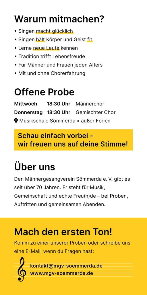 Bist du musikbegeistert und hast Lust, deine Stimme im Chor zu erheben? Dann werde Teil des Männergesangvereins! Wir suchen neue Stimmen und freuen uns auf jede*n, der*die Freude am Singen hat und Teil einer tollen Gemeinschaft werden möchte. Egal, ob du viel Erfahrung im Singen hast oder einfach mal etwas Neues ausprobieren möchtest – jeder ist herzlich willkommen!